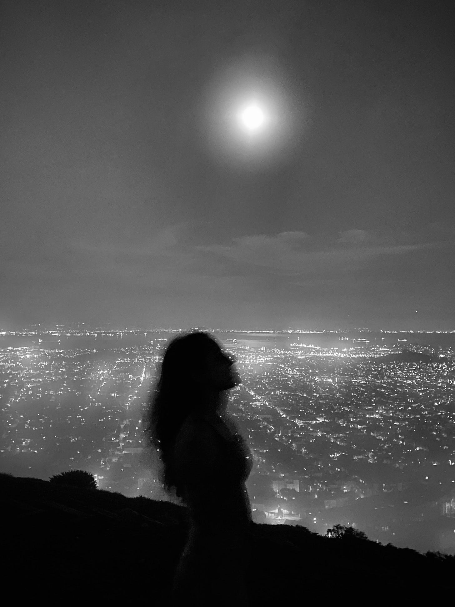 I remember walking over to see it, our shoulders brushing like it was the most natural thing in the world. We both leaned in, squinting at the tiny screen. Against the black of the sky, I was almost featureless. Just shape and posture and presence. The moon resting just above the crown of my silhouette. The city glittering far behind like they were just shining for me. It felt like someone had captured my soul.